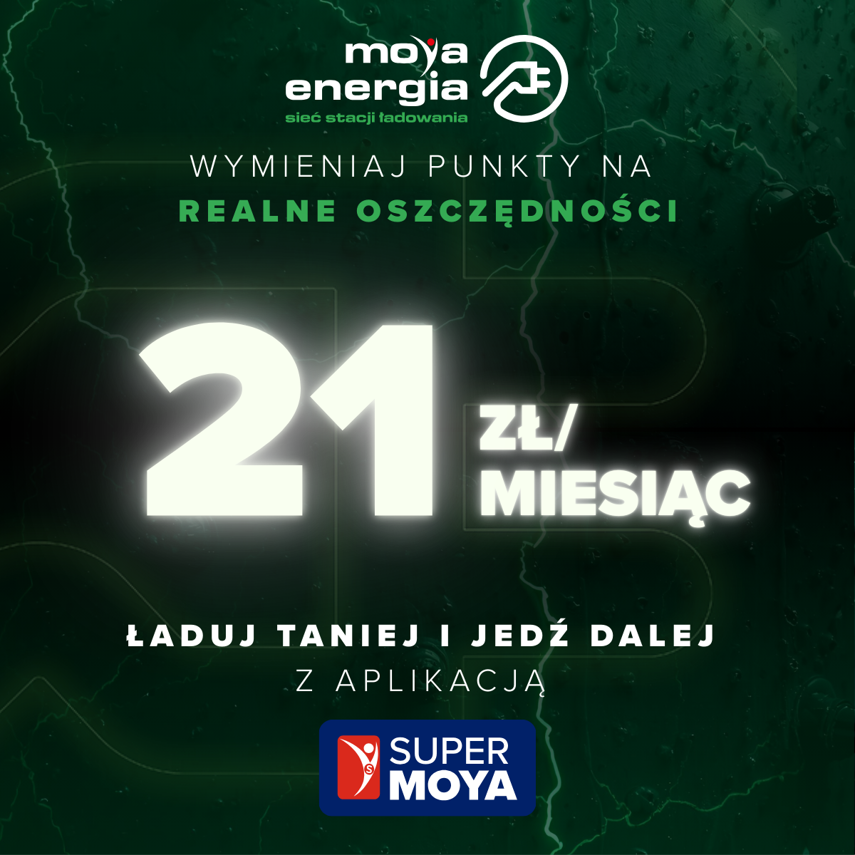 - 10 pkt za każdą pobraną kWh za ładowanie na stacjach MOYA energia,
