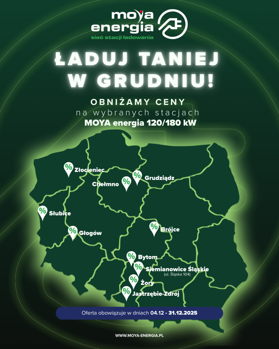 Od 4 grudnia do końca miesiąca kierowcy samochodów elektrycznych mogą skorzystać z obniżonych cen ładowania na wybranych stacjach MOYA energia. Grudzień to okres większej mobilności i częstszych wyjazdów, dlatego przygotowaliśmy zniżki, które ułatwią codzienne ładowanie i zwiększą komfort podróży we wczesnym sezonie zimowym. Łącznie 10 lokalizacji w całej Polsce zostało objętych grudniową zniżką, dzięki czemu powrót na trasę będzie teraz jeszcze korzystniejszy.