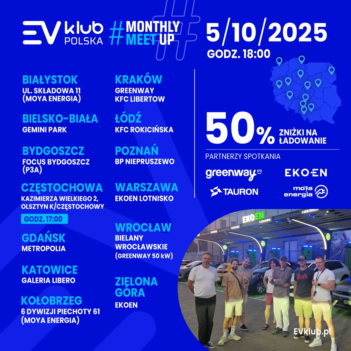 W niedzielę, 5 października 2025 roku, na dwóch stacjach MOYA energia – w Białymstoku (ul. Składowa 11) oraz Kołobrzegu (ul. 6. Dywizji Piechoty 61) – odbyły się spotkania w ramach inicjatywy EV Klub Polska – Monthly Meetup. To cykl comiesięcznych wydarzeń skierowanych do pasjonatów elektromobilności w całej Polsce, organizowany przez EV Klub Polska, a wspierany przez partnerów z branży, w tym – po raz pierwszy – przez MOYA energia.
