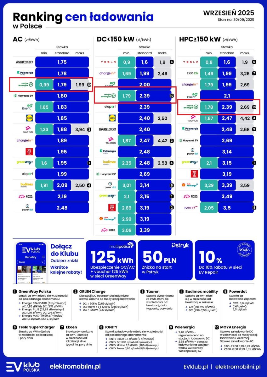 Ranking EV Klub Polska za wrzesień akcentuje dwie istotne rzeczy: koniec wakacyjnych promocji u wielu operatorów i powrót do standardowych stawek oraz duże rozstrzały cen między sieciami i ofertami ładowania. W takim krajobrazie strategia MOYA energia — bardzo tanie ładowanie nocną na portach AC oraz atrakcyjne 1,79 zł/kWh na 60 kW oraz stabilne, przewidywalne ceny na stacjach 120 i 180 kW — zdecydowanie się sprawdza i cieszy się coraz większym zainteresowaniem użytkowników EV.