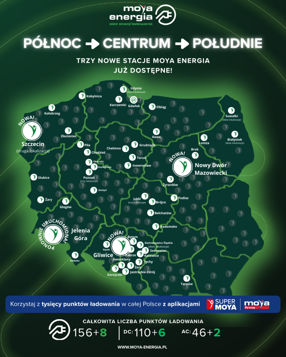 Rozwój infrastruktury ładowania w Polsce nabiera tempa, a my konsekwentnie dokładamy kolejne punkty do mapy MOYA energia. Dziś wracamy z podwójną informacją – ogłaszamy uruchomienie trzech nowych stacji w kluczowych lokalizacjach oraz potwierdzamy powrót do pełnej operacyjności jednej z wcześniej wyłączonych stacji.