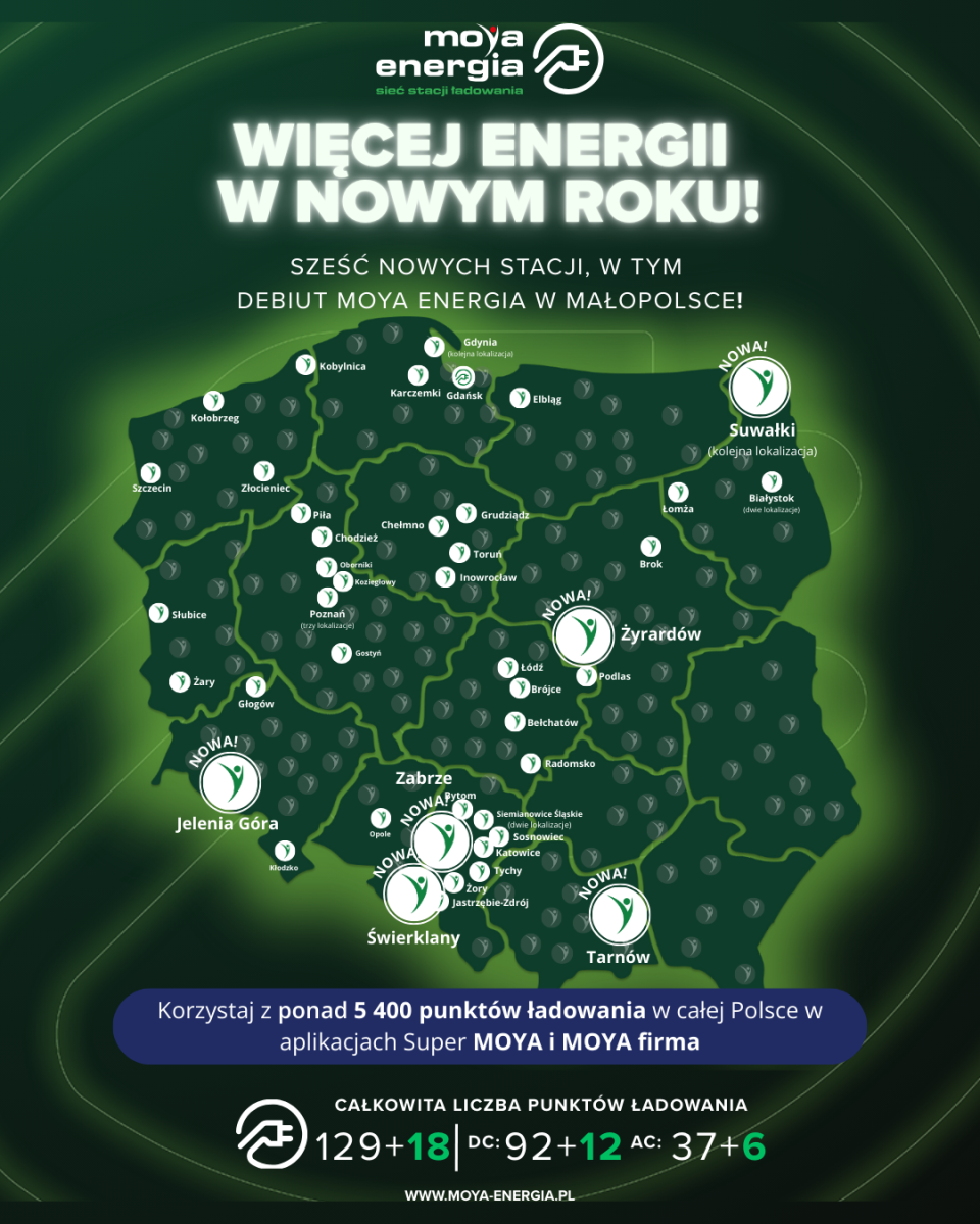 Otwarcie sześciu nowych stacji to wyraźny sygnał, że MOYA energia wchodzi w nowy rok z nową dynamiką i jasno określonym kierunkiem dalszego rozwoju. Stawiamy na lokalizacje, które realnie wspierają codzienne użytkowanie samochodów elektrycznych – zarówno w dużych miastach, jak i w mniejszych miejscowościach, na trasach lokalnych i tranzytowych.